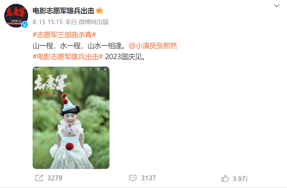 照片中的小演员是身着白色裙装,佩戴红色花朵的小丑形象,配文“山一程,水一程,山水一相逢。@小演员张熙然 #电影志愿军雄兵出击#2023国庆见”。