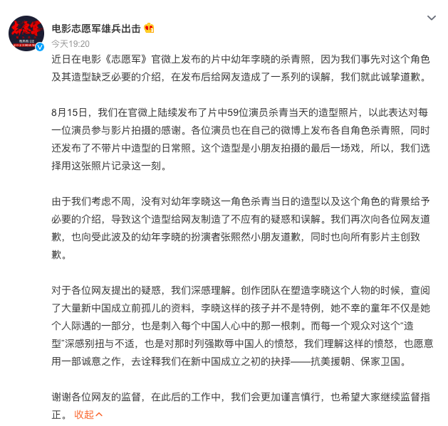 由于考虑不周,没有对幼年李晓这一角色杀青当日的造型以及这个角色的背景给予必要的介绍,导致这个造型给网友制造了不应有的疑惑和误解。再次向各位网友道歉,也向受此波及的幼年李晓的扮演者张熙然小朋友道歉,同时也向所有影片主创致歉。