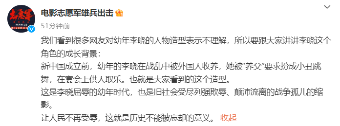 制片方在文中表示,看到很多网友对幼年李晓的人物造型表示不理解,要跟大家讲讲李晓这个角色的成长背景:新中国成立前,幼年的李晓在战乱中被外国人收养,她被“养父”要求扮成小丑跳舞,在宴会上供人取乐。也就是大家看到的这个造型。这是李晓屈辱的幼年时代,也是旧社会受尽列强欺辱、颠沛流离的战争孤儿的缩影。让人民不再受辱,这就是历史不能被忘却的意义。