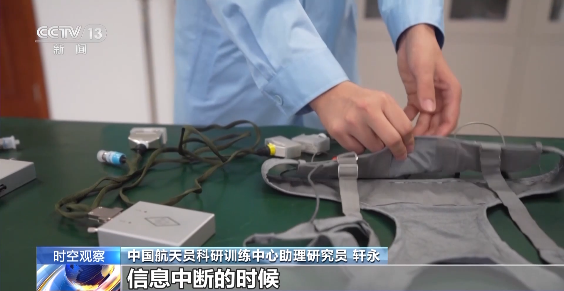 中国航天员科研训练中心助理研究员 轩永:这是背心,采集模块跟背心配合,负责信息的采集处理,储存模块负责存储,比如在返回过程中,飞船进入黑障,信息中断的时候,通过它来把信息数据存储下来,方便地面进行分析。