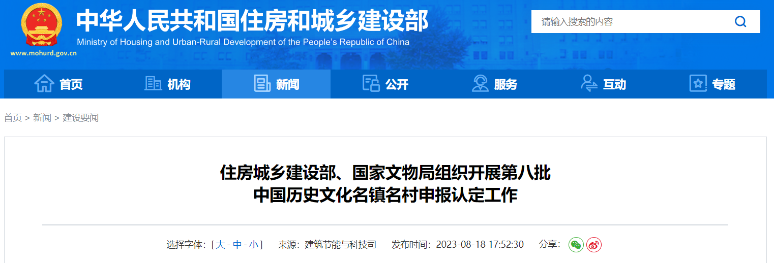 历史文化名镇名村是中华优秀传统文化的重要载体,集中展现了我国优秀传统建筑风貌和建筑艺术,是人民群众的乡愁所系。为深入贯彻落实党中央、国务院加强历史文化保护传承相关决策部署,住房城乡建设部、国家文物局近日发布《关于组织申报第八批中国历史文化名镇名村的通知》(以下简称《通知》)。《通知》指出,为弘扬传统民族文化,保护镇(村)的传统格局和历史风貌,促进优秀传统建筑艺术的传承和延续,根据《历史文化名城名镇名村保护条例》,两部门决定开展第八批中国历史文化名镇名村的申报认定工作。