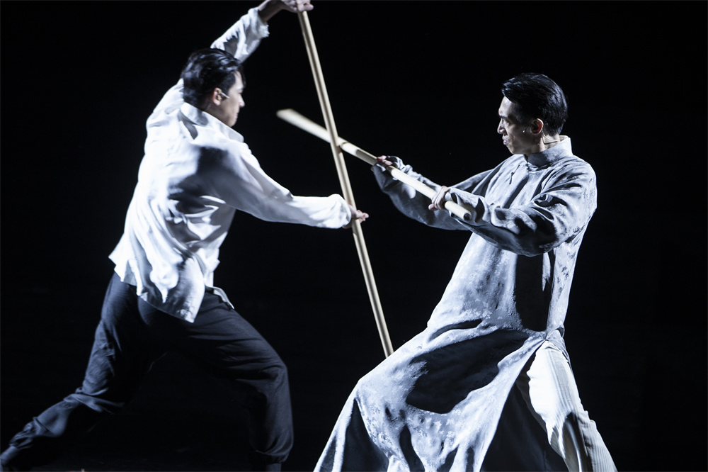大家熟悉的香港武打电影,往往靠剪辑和特效制造出令人炫目的打斗场面;但徐浩峰的新派武侠电影之所以独树一帜,因为有着武学功底和人文精神的他设计的武打动作,讲究干净利落、拳拳到肉的写实打斗,把握住了现实环境中武打场面的真实性,以现实主义笔触还原出当时人物的行为方式和精神状态。也正是因为这样的武打风格,徐浩峰可以不借助电影特效手段,将实打实的武打场面搬上戏剧舞台,给人以更加身临其境的逼真之感。《搭手飞人》中的武打场面并不多,也没有电影里那种势均力敌你死我活的激烈较量,基本上是实力悬殊,点到为止,重在体现故事情节和人物命运。
