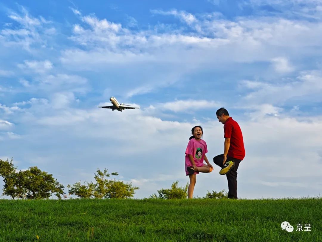 一架国产ARJ21飞机在夏日晴空翱翔,俯瞰着地面上玩传统健身游戏的快乐父女。柳峰摄