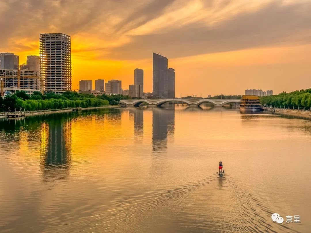 晚霞把天空涂抹成金黄色,北京通州北运河上一名桨板运动爱好者正奋力滑向正前方的千荷泻露桥。王丹枫摄