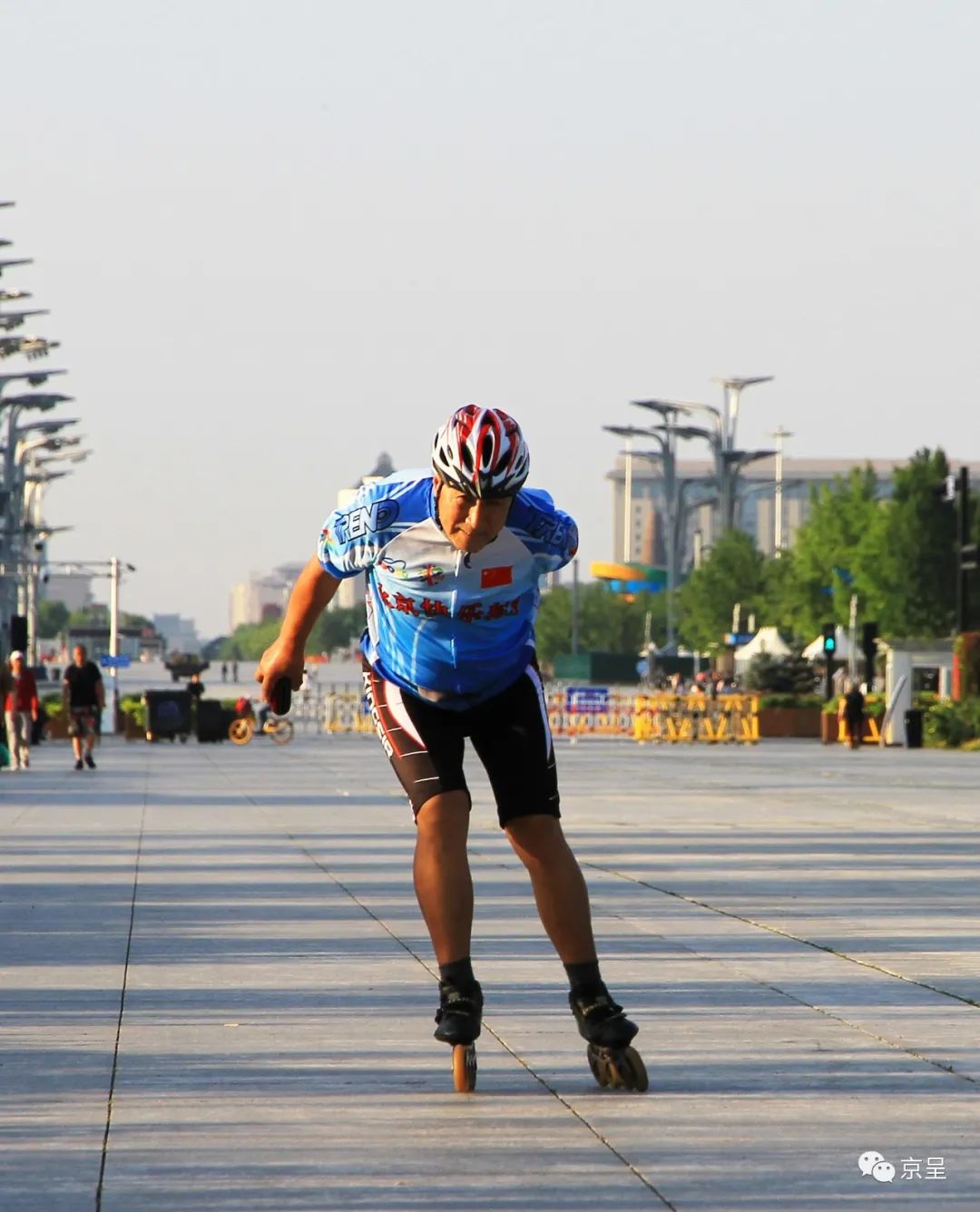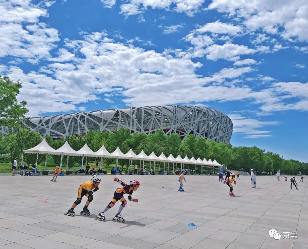 奥林匹克公园,轮滑少年在“鸟巢”前的广场上认真训练,身手矫健。黄楠摄