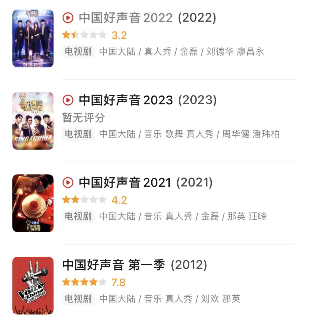 当年《中国好声音》第一季的网络评分是7.8,而2020年、2021年、2022年的三季节目评分分别是5.3、4.3、3.2,呈现断崖式下跌。新一季节目因为李玟生前录音事件不断发酵处于舆论旋涡中,要想逆势挽救不断下滑的风评更是难上加难。这档已经播出12年的长寿综艺在一个轮回的时候公信力受到考验,口碑崩塌速度惊人,如果不能从根本上挽回人心,提升作品水平,即使有所谓的形式创新恐怕也无异于强弩之末。