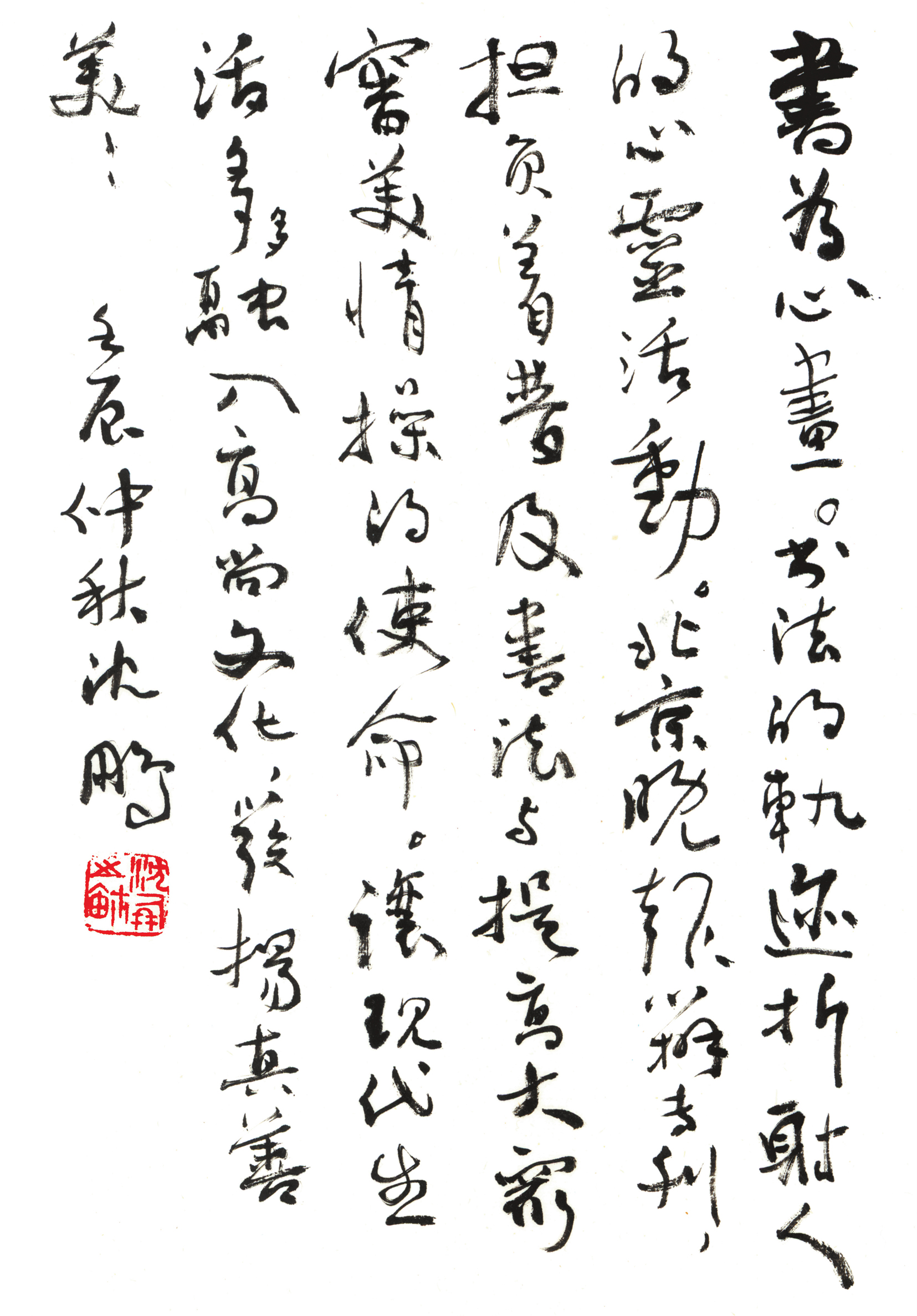 沈鹏先生还有一个身份,那就是北京晚报《墨缘》周刊顾问。2012年,北京晚报《墨缘》周刊创刊,沈鹏先生特意为《墨缘》挥毫寄语编辑和读者:“书为心画,书法的轨迹折射人的心灵活动。北京晚报办专刊,担负着普及书法与提高大众审美情操的使命。让现代生活多多融入高尚文化,发扬真善美!”沈鹏先生评价,在当前社会上盛行急功近利的种种浊流中,北京晚报《墨缘》保持了自身的定力,追求高品位、高格调,说得上是一方风清气正的书法净土。戊戌年初,他还应北京晚报之约撰写一副对联:世界大同抒美景;少年中国发宏图。