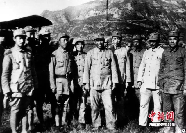 1938年,邓小平、朱德、周恩来、彭德怀、贺龙等人合影。