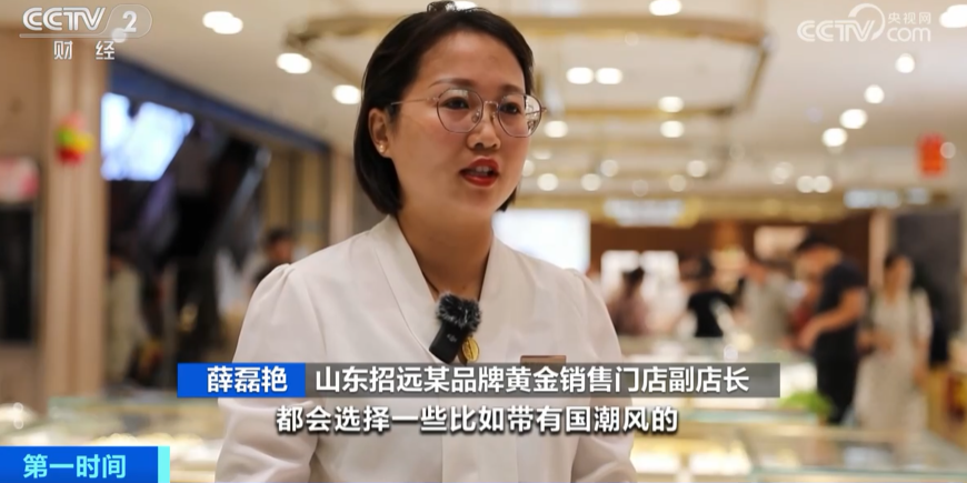 山东招远某品牌黄金销售门店副店长 薛磊艳:现在很多进店顾客是年轻人,他们购买首饰会选择一些带有国潮风的,作为礼物送给自己的爱人。