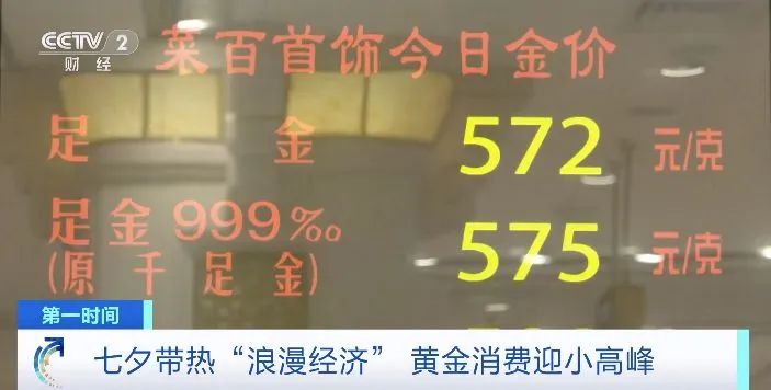 七夕前的周末,北京菜市口的一家黄金珠宝首饰门店黄金首饰专区人头攒动。店内屏幕显示当日足金价每克572元。工作人员表示,近期每天从上午10点开始营业消费者就络绎不绝。