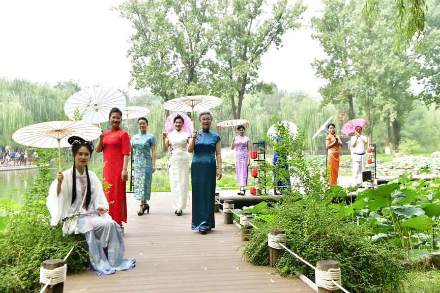 游客身穿汉服、旗袍游览景区。