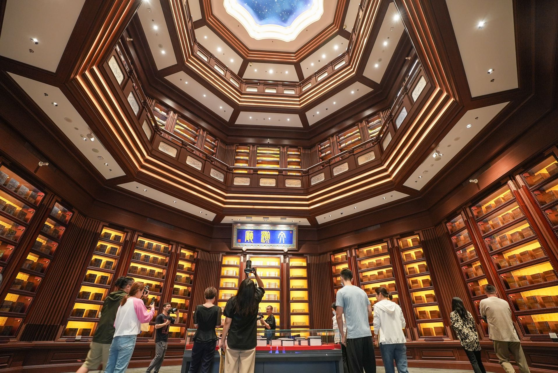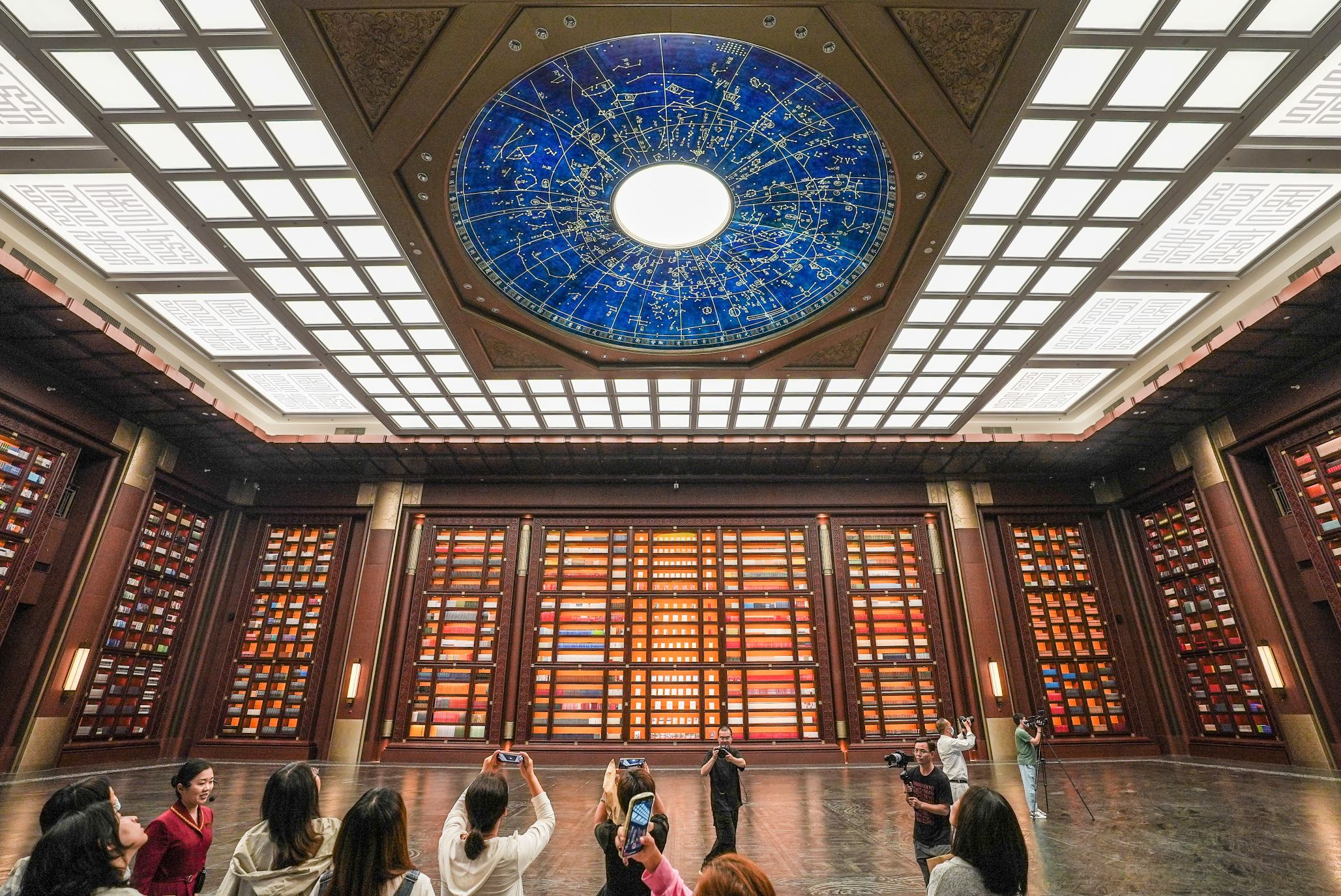步入主建筑文华堂,中央挑空两层高13米、面积1350平方米的国家书房让人眼前一亮——仰观穹顶,取自宋代石刻天文图的满天星宿点缀其中,寓意中华文明如星空般浩瀚璀璨;环视四周,15组书柜、3万余册古今经典汇成文山字海,彰显厚重文化底蕴。