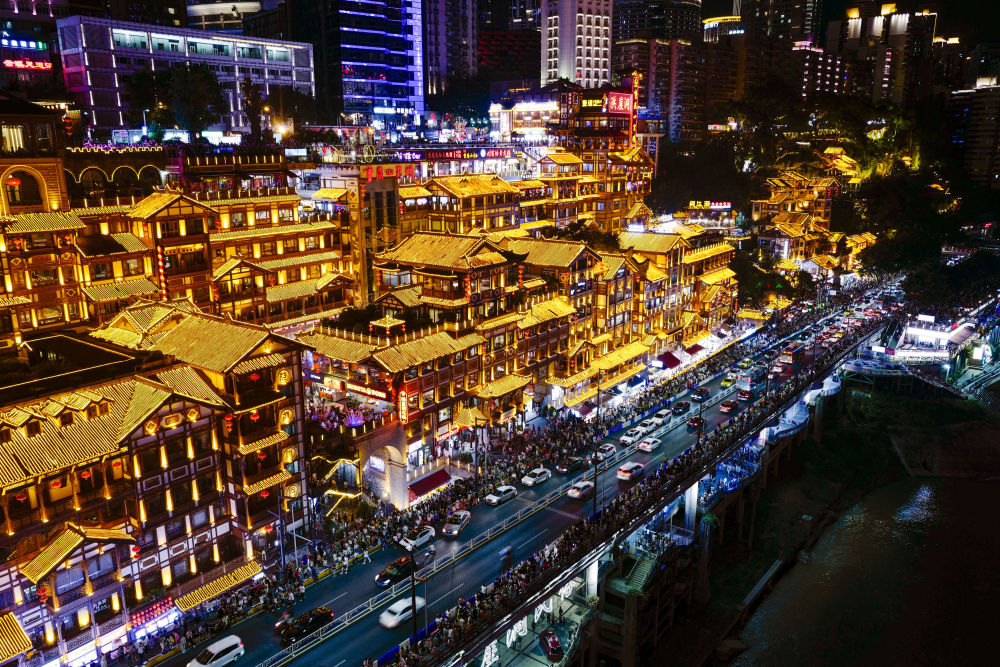 仲夏之夜,洪崖洞吊脚楼式建筑群临江而立、攀岩直上,璀璨夺目的灯光,与熙熙攘攘的游客、鳞次栉比的门店构成一幅热气腾腾的“山水不夜城”图景。