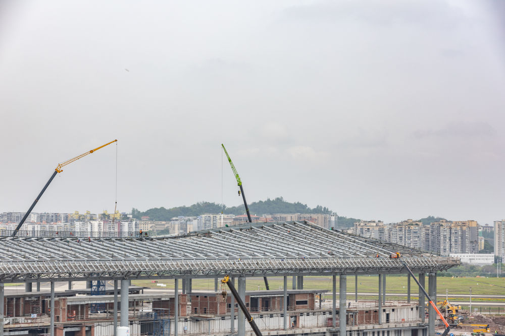 2023年4月29日,工作人员在重庆江北国际机场T3B航站楼施工现场进行屋面施工。新华社记者 黄伟 摄