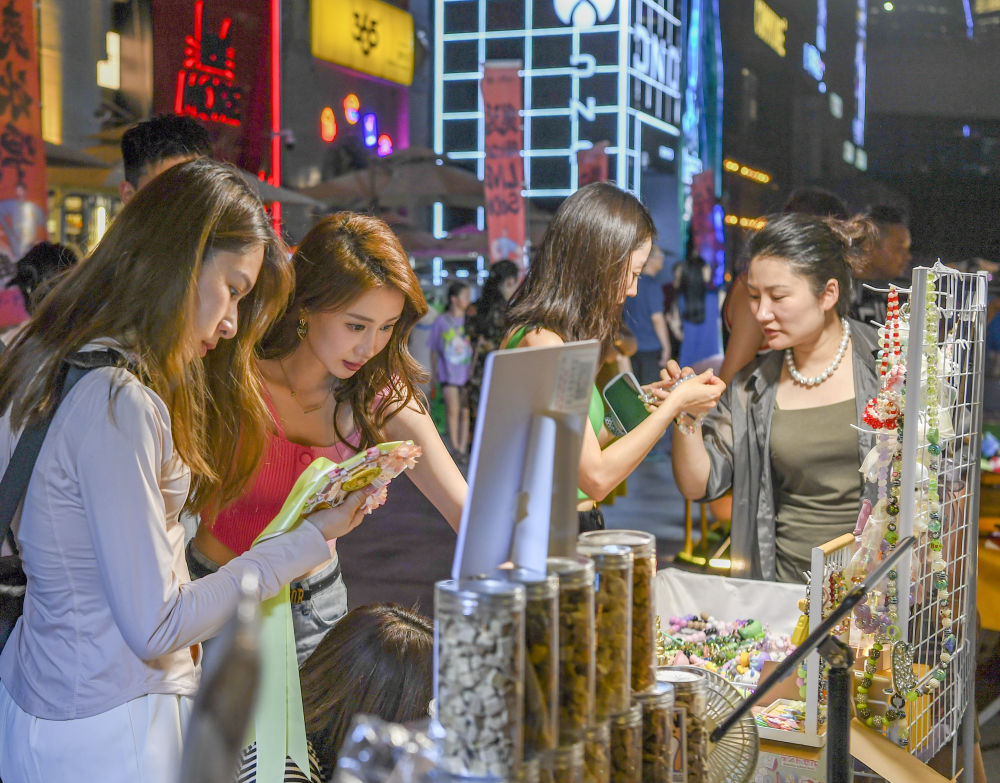 消费者在位于重庆市江北区鎏嘉码头的小熊集市选购饰品(2023年8月4日摄)。新华社记者 王全超 摄
