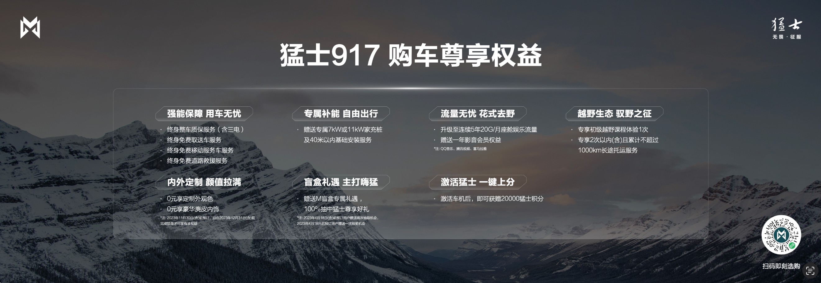 活动现场,猛士科技同步发布为天使用户尊享定制的猛士917创始版,增程车型售价67.8万元,纯电车型售价73.9万元。该版本此前已面向猛士917天使用户限定打造200台,现场加推的10台猛士917创始版车型,当场售罄。与此同时,猛士917创始版还为用户提供了六重专属礼遇。