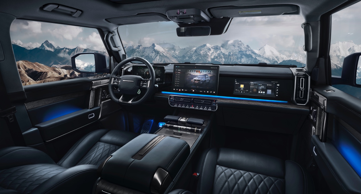 当智能科技与硬派越野座舱相遇,豪华科技质感尽显。猛士917构建了“全液晶仪表盘、中控屏、副驾屏、后排屏、HUD”五屏多元互动系统,实现了5G远程智联、蓝牙钥匙、车辆状态监测、遥控泊车等功能。