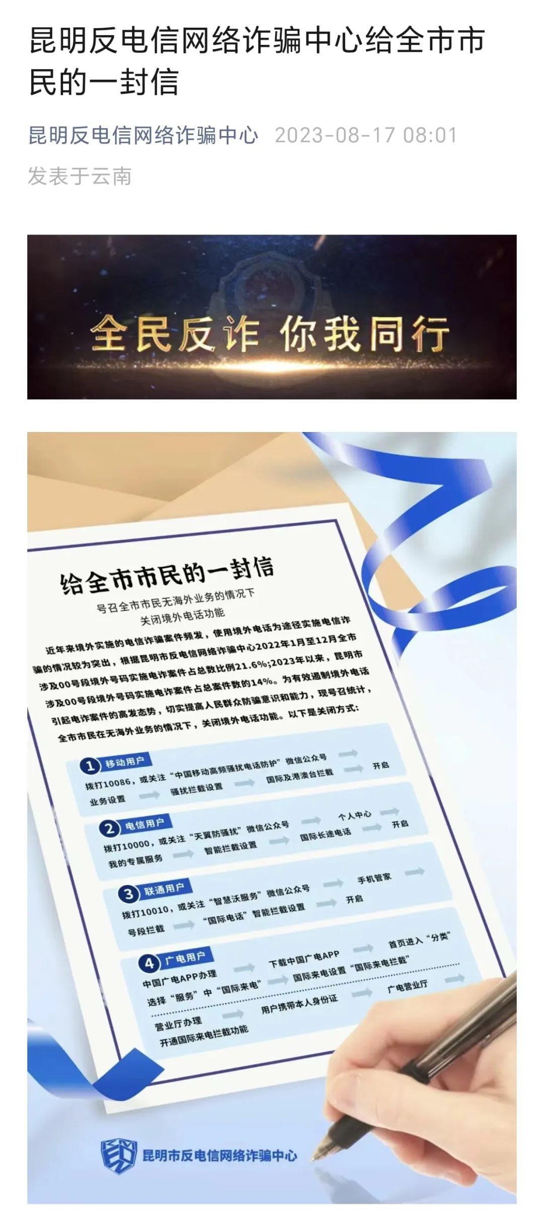 8月17日,昆明反电信网络诈骗中心发布《昆明反电信网络诈骗中心给全市市民的一封信》,信中称: