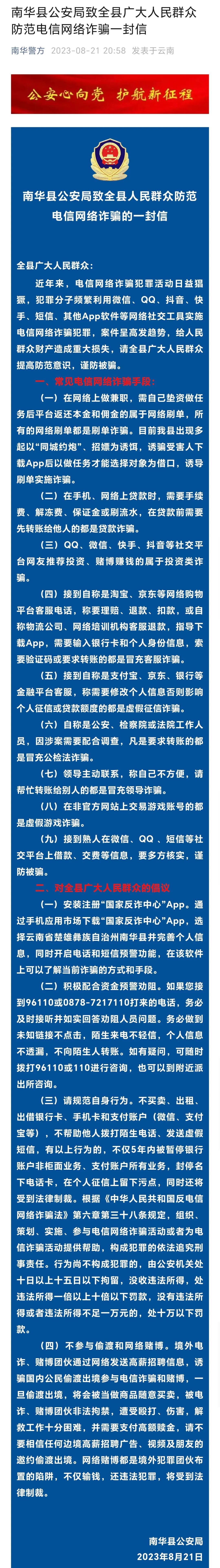 8月21日,云南楚雄州南华县公安局发布《南华县公安局致全县广大人民群众防范电信网络诈骗一封信》,信中提醒: