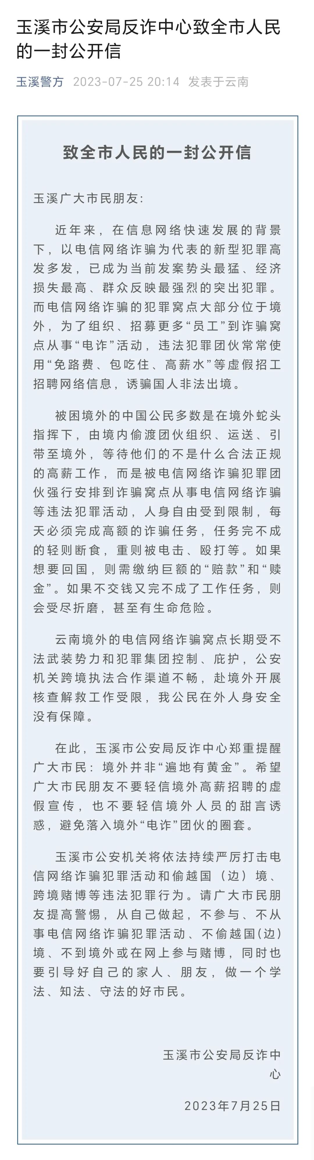 此前,云南玉溪市公安局反诈中心也发布了《玉溪市公安局反诈中心致全市人民的一封公开信》,其中提示: