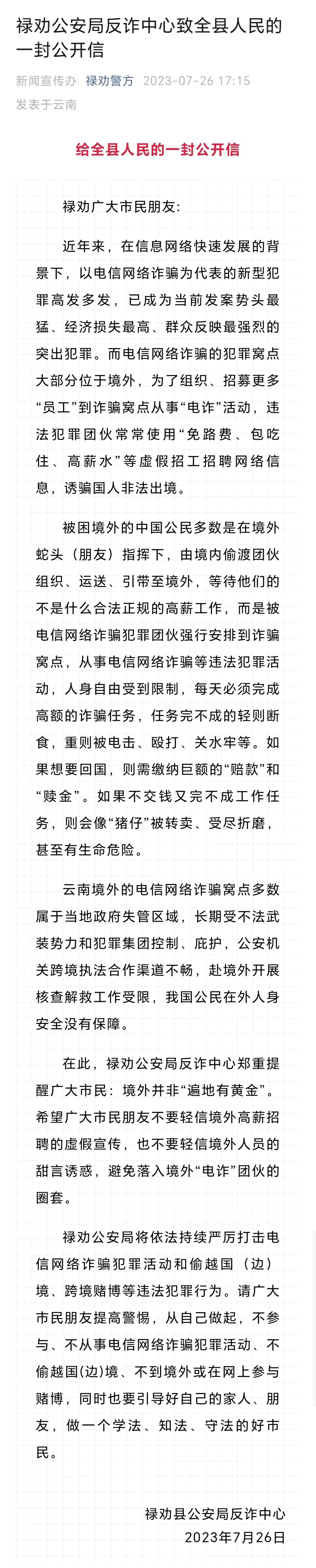 云南昆明禄劝县公安局反诈中心此前发布《禄劝公安局反诈中心致全县人民的一封公开信》,信中提到: