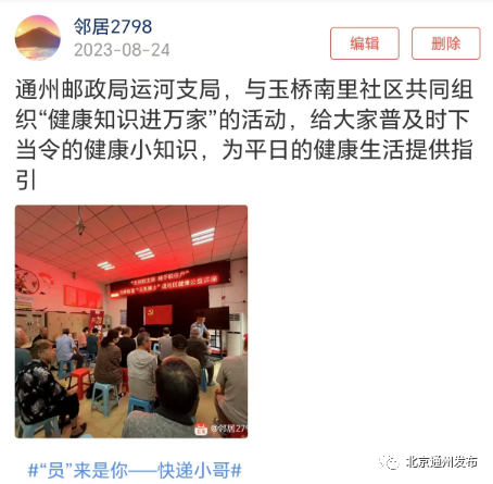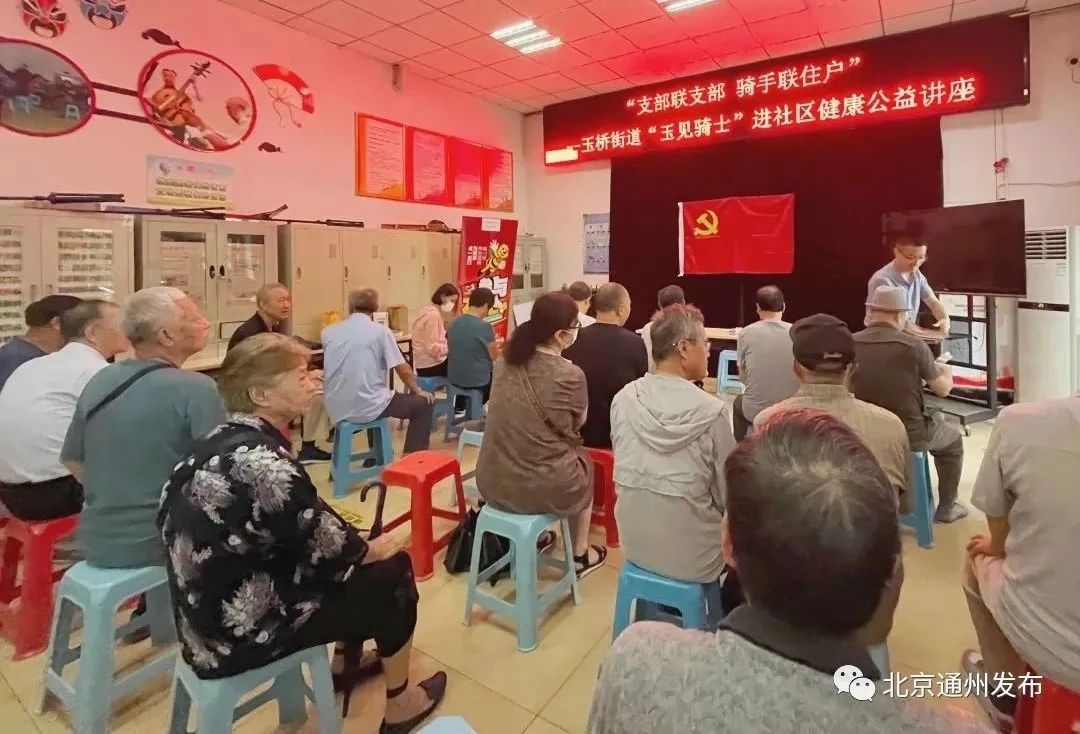 在日常接触中,“玉见骑士”反映社区许多老年人希望能多了解一些养生健康注意事项,街道新就业群体流动党支部了解到这一情况后,迅速部署,8月23日联合通州邮政局运河支局金鹰网点党支部,与玉桥南里社区共同开展“支部联支部,骑手联住户”玉桥街道“玉见骑士”进社区健康公益讲座活动。针对老年人常见疾病的发病机理、疾病预防与治疗等方面进行了详细介绍,建议老年人在生活中要合理用药、合理膳食,注意生活细节,保持身体健康,活动受到广大居民热烈欢迎。