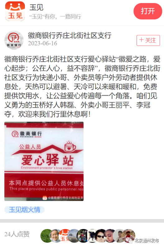 同时将进一步组织商户成为“骑士联盟”爱心商家,让外卖、快递小哥累了能歇脚、饭凉能加热、闲时能充电、心烦能倾诉,共同筑起“玉见骑士”的温暖幸福家。