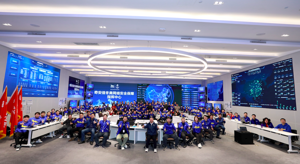 2022年冬奥会期间,奇安信网络安全保障中心成为冬奥网络安全保障指挥中心,参与保障工作的员工合影留念