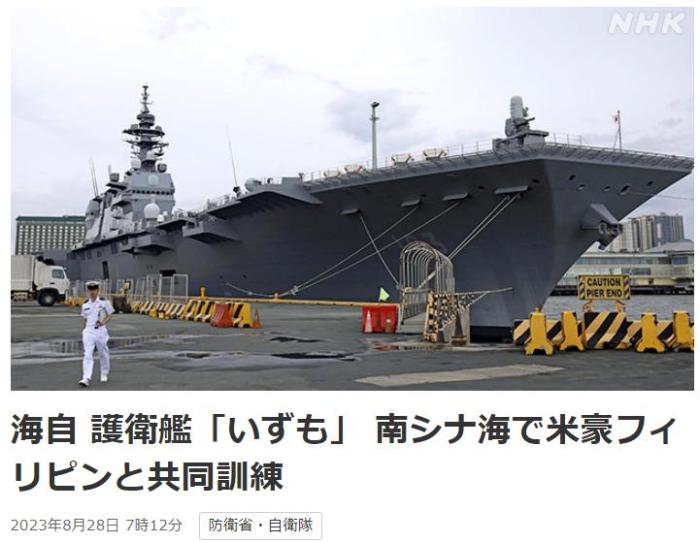综合日媒报道,27日,日本海上自卫队公开了准航母“出云”号停靠菲律宾首都马尼拉的画面,并称该舰在24日曾与美国、澳大利亚和菲律宾三国军舰进行了联合演习。