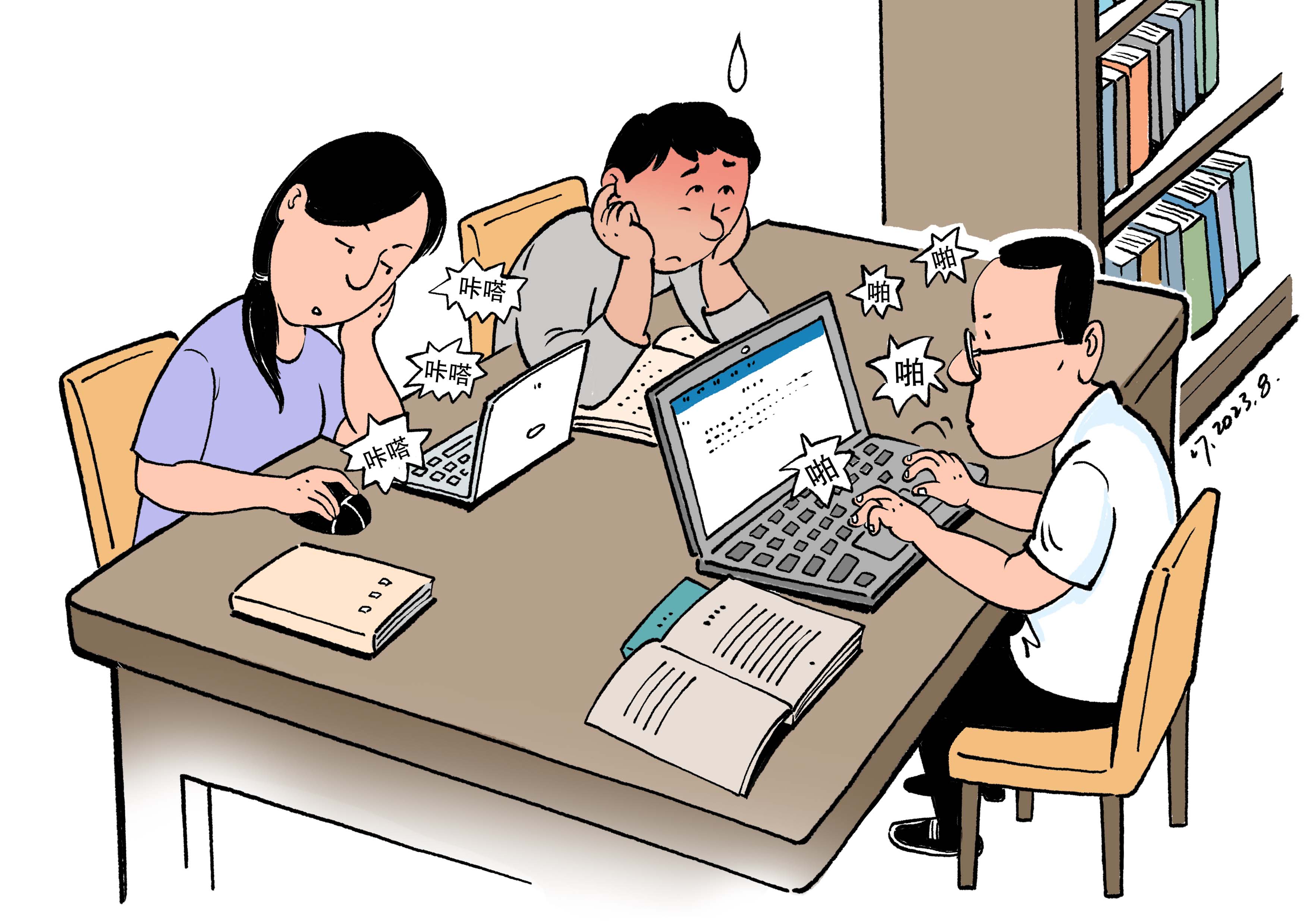 如今,带着笔记本电脑到图书馆看书学习的读者越来越多,敲击键盘与滑动鼠标的声音此起彼伏。一边看书查资料,一边在电脑上工作学习,算是好习惯;前提是不能干扰他人阅读。图书馆可以兼顾不同读者需要,但阅览区域应该尽量静音。默读,更文明。