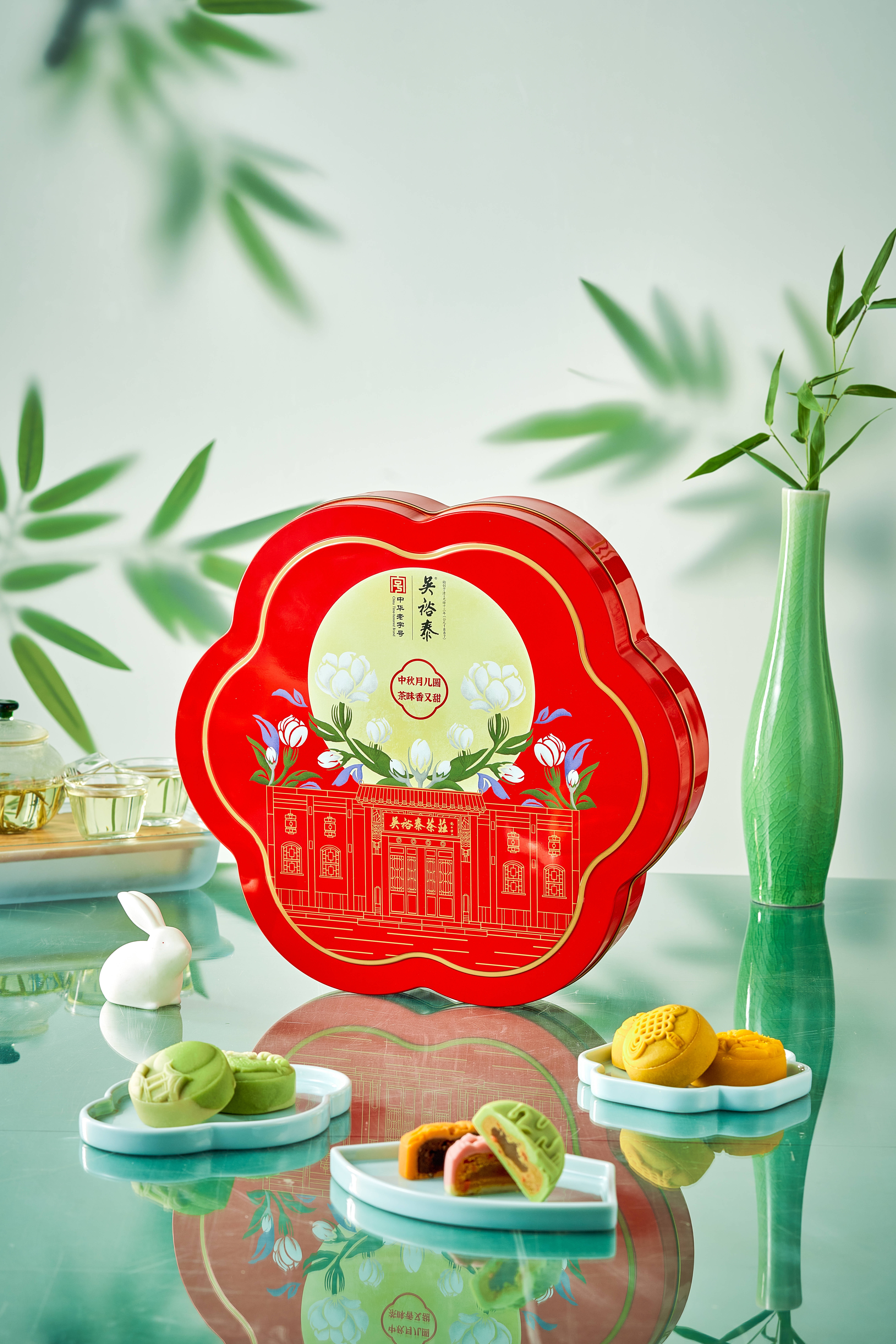今年,围绕“中秋月儿圆 茶味香又甜”进行创意设计,将吴裕泰门头、团花以及象征中秋的圆月巧妙结合,将花香茶味融入月中,传递出团圆美满的祝福。八粒装盒型取自六瓣梅花,古语云“梅出六为贵”,代表六六大顺、幸福美满。十三粒装盒型源自于古典的提梁食盒,造型精巧、古典。中秋月儿圆,美味在身边,茶味香又甜,老吴常相伴。