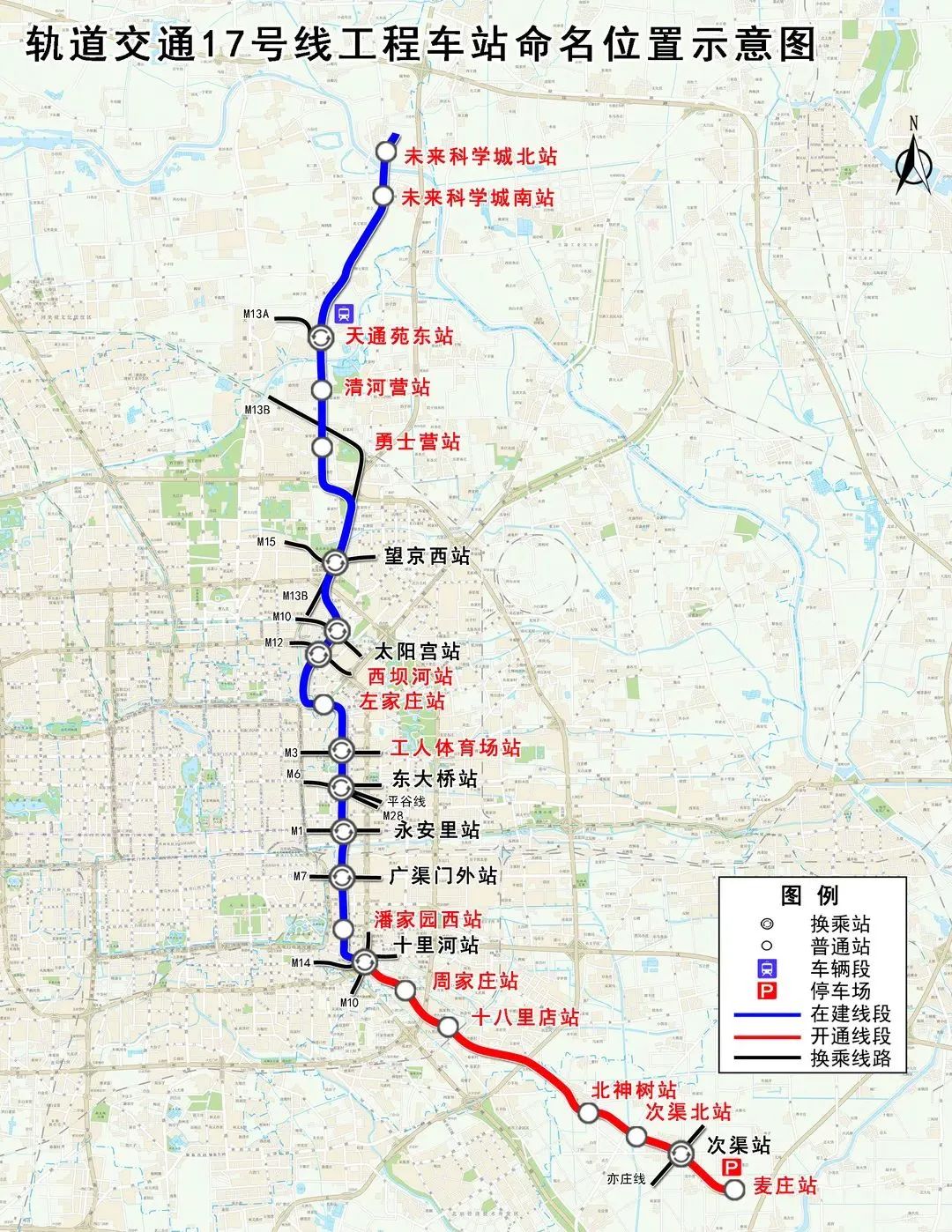 2021年底十里河站以南段16.5km含7座车站已开通试运营。计划2023年年底开通的17号线工程北段长度26.3km(工人体育场站—未来科学城北区站),含10座车站+歇甲村车辆段,连接朝阳、昌平区。