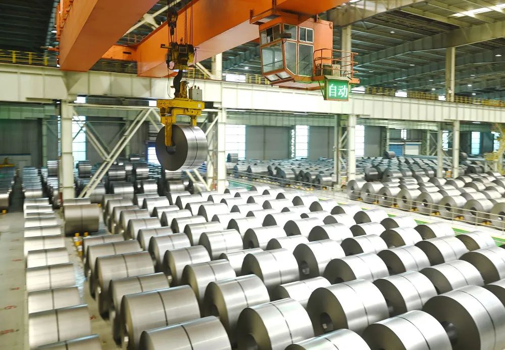 河钢集团邯钢公司生产线上的智能吊运设备在吊运钢板(图源:新华社)