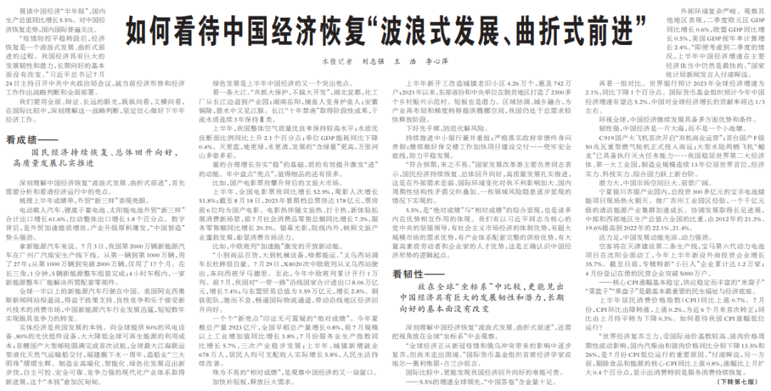 文章开篇就引用了7月24日习近平总书记主持召开中央政治局会议时,就当前经济形势和经济工作作出的一个重要战略判断:“疫情防控平稳转段后,经济恢复是一个波浪式发展、曲折式前进的过程。我国经济具有巨大的发展韧性和潜力,长期向好的基本面没有改变。”