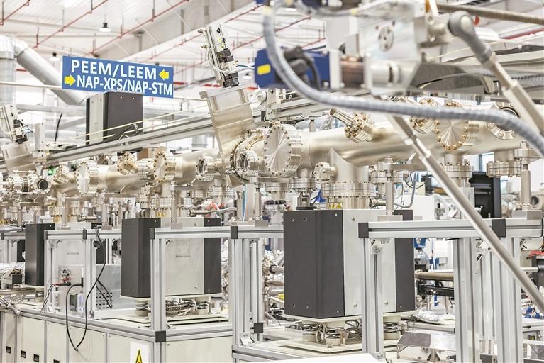 深入实验站内的科研区域,仿佛进入了电影中的未来世界——总长203米的银色超高真空管道纵横交错,将40台大型设备联接起来,磁性传输小车载着样品以每分钟3.2米的速度驶过真空管道内的轨道,并由管道外履带上的磁铁“导航”至各个设备节点。
