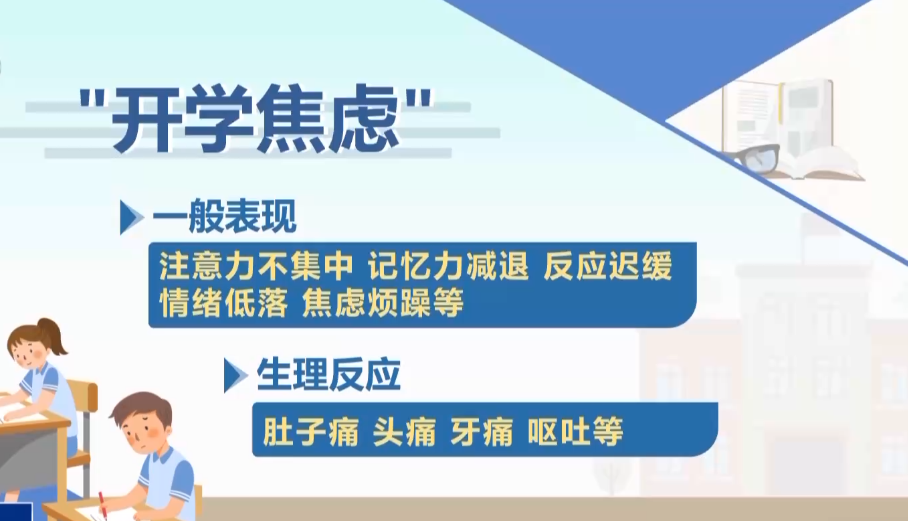 “开学焦虑”一般表现为注意力不集中、记忆力减退、反应迟缓、情绪低落、焦虑烦躁等,也有学生的焦虑表现从心理反应向生理反应发展,比如出现肚子痛、头痛、牙痛、呕吐等。这些并非孩子的身体病了,也非孩子“装病”,而是焦虑情绪所导致的身体反应。