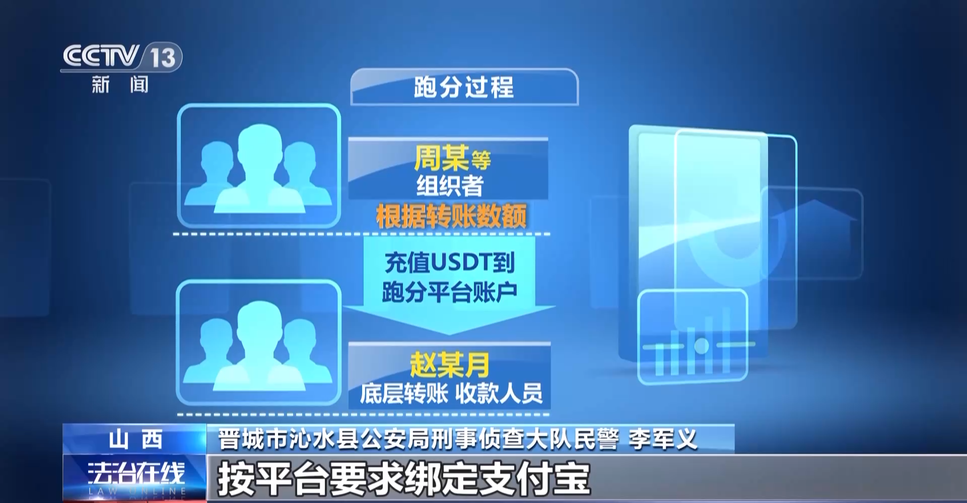 晋城市沁水县公安局刑事侦查大队民警 李军义:赵某月在这个团伙中属于底层转账、收款人员,根据周某等组织者提供的卖家收款账户进行具体的付款操作,然后周某等组织者再根据他们转账的数额,把USDT充值到跑分平台的账户里。赵某月等这些跑分人员按平台要求绑定支付宝、数字人民币钱包等收款方式分批完成收款,这样就完成了跑分过程,并获取平台返还的收款金额1.5%左右积分作为佣金来牟利。