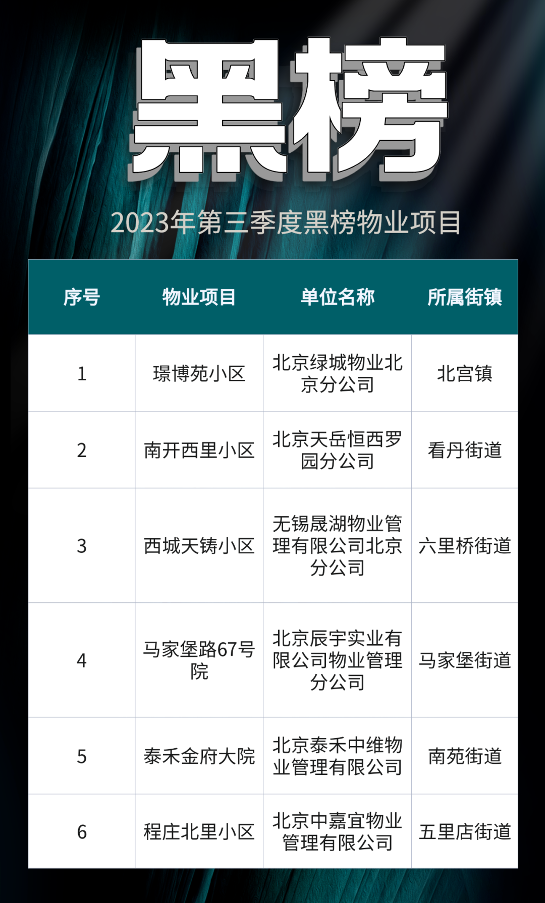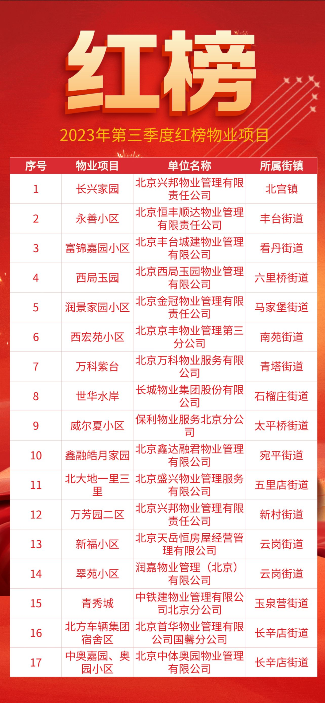 丰台区物业管理工作专班结合我区住宅物业项目的物业管理服务效能、接诉即办诉求情况以及日常检查情况进行综合评价,形成2023年第一批丰台区住宅物业服务红黑榜,现予公布。