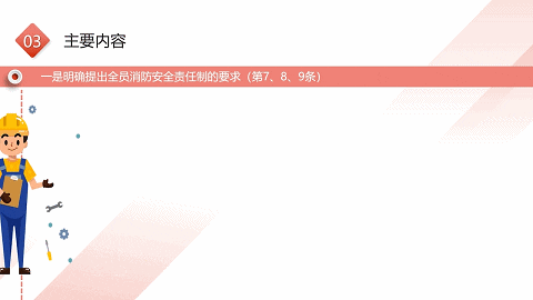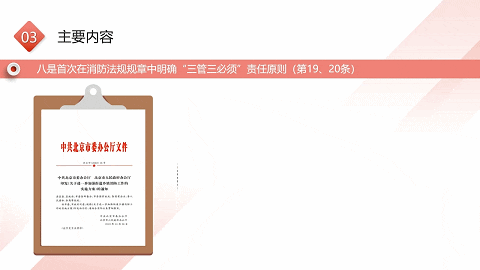 规定了单位内部涵盖主要负责人、分管负责人、消防安全管理人员以及逐级逐岗的全员消防安全责任体系,特别是明确了各类社会单位“一把手”的消防安全第一责任,履行“健全全员责任制、保障硬件设施和日常管理安全合规、保障消防资金投入、定期研究消防重大问题”等四项核心责任内容;