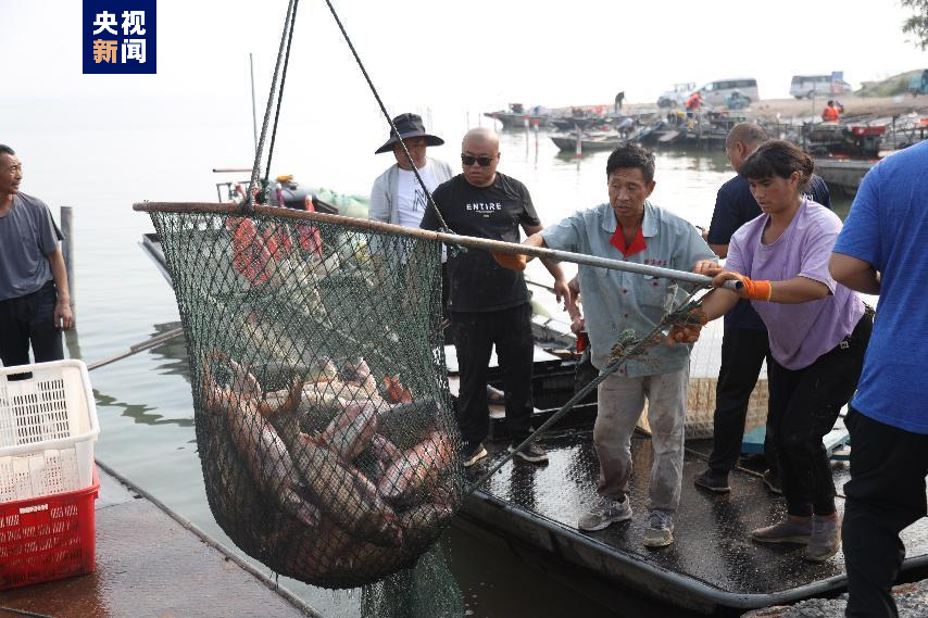 在满载而归的渔船上既有鲤鱼、鲢鱼、草鱼、鳜鱼、鲫鱼,还有河蟹、小龙虾、甲鱼等湖鲜,其中渔民刘忠诚捕捉到一条 41.6斤的鲢鱼,获得今年的鲢鱼王称号。