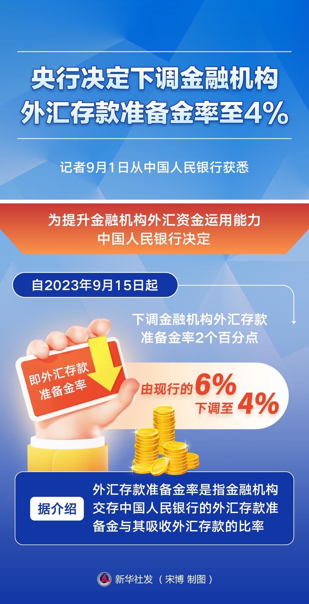 新华社北京9月1日电(记者吴雨)记者1日从中国人民银行获悉,为提升金融机构外汇资金运用能力,中国人民银行决定,自2023年9月15日起,下调金融机构外汇存款准备金率2个百分点,即外汇存款准备金率由现行的6%下调至4%。