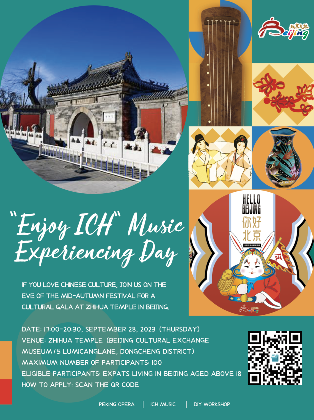 其中“乐享非遗-非遗体验日”将于9月28日在北京智化寺举行。面向社会招募的100位在京外籍人士,可以前来欣赏智华寺京音乐。参与者可体验戏曲主题庭院雅集,欣赏国家级非物质文化遗产智华寺京音乐演奏。拟于10月14日举行的“小兔乖乖-非遗家庭日”沉浸式体验活动,将邀请40个外籍家庭前往北京圣露庄园,现场体验多项北京非遗文化项目。感兴趣的在京外籍人士可通过扫描活动宣传海报二维码报名。