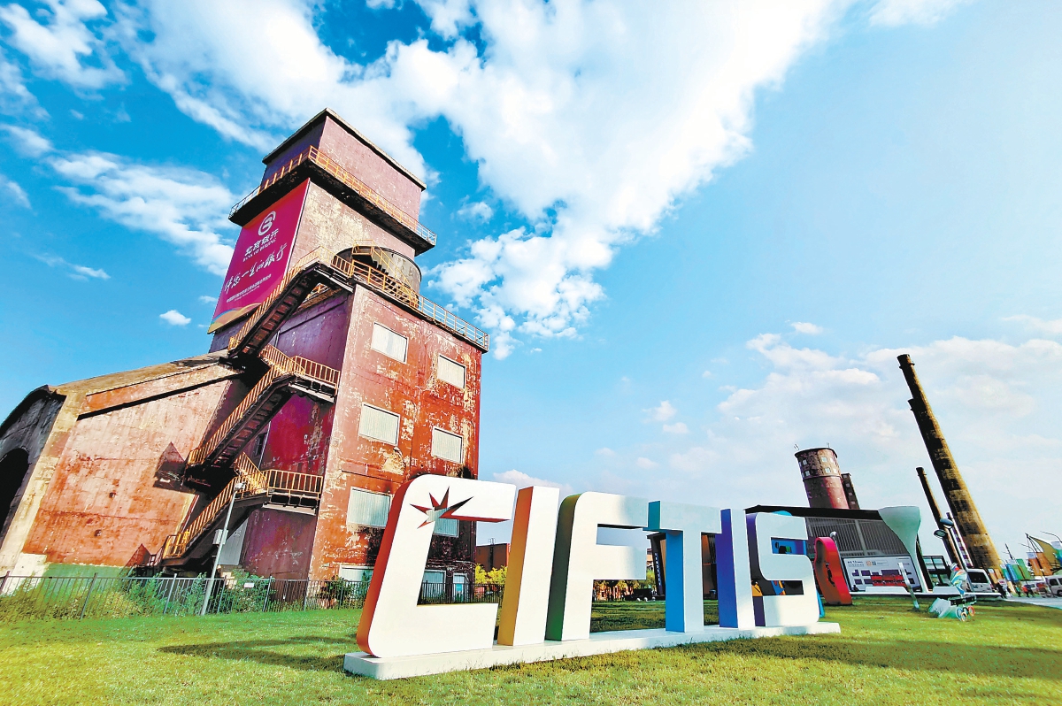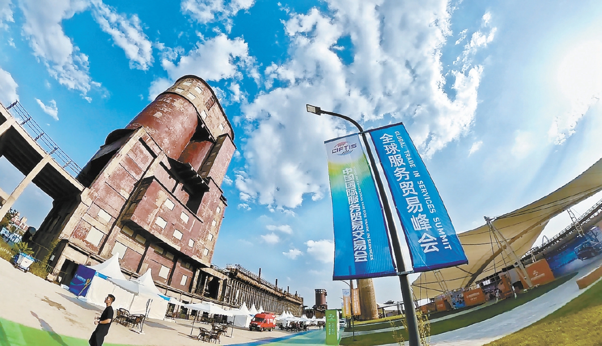 蓝天白云下,工业遗址耸立,服贸会标志十分醒目。