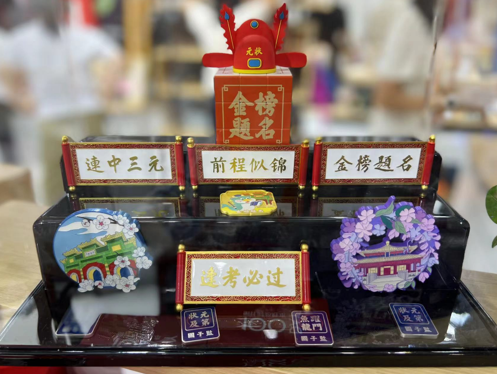 孔庙和国子监博物馆带来了暑期爆火的三色文创雪糕,将国子监“琉璃牌楼”建筑元素及“独占鳌头”文化元素有机结合,吃完雪糕后,观众还会发现雪糕棒上写有“金榜题名”“鱼跃龙门”等字样,收到来自博物馆的美好祝愿。此外,该馆还展出了“君子六艺”汝窑瓷器套装、“国子莘莘”五色文具套装,以及以国子监太学生日常学习生活为主题的盲盒等新品。