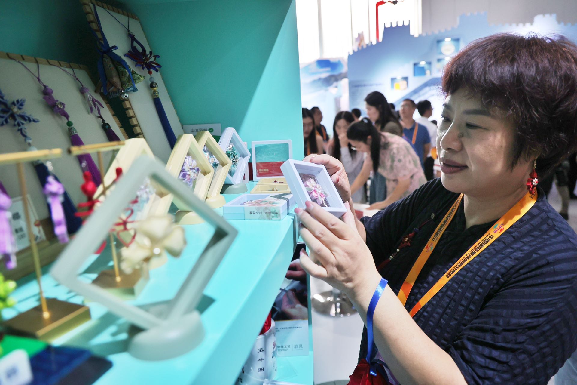 “京西福地 山水文化融城”的石景山展区里,京式旗袍传统制作技艺第五代传承人张凤兰带来了她最新创作的楸树花胸针,这是立足京式旗袍开发的以盘扣为核心的文创衍生品,共有8款配色,历时半年创作完成,均为纯手工打造。“楸树花有‘楸树开花,带福还家’之意,我结合非遗合香制作技艺项目西山晴雪香料创作了这款胸针,材料采用真丝素缎,借助旗袍硬盘扣的独特制作工艺,纯手工钉珠做成了这款精美饰品。”张凤兰介绍。