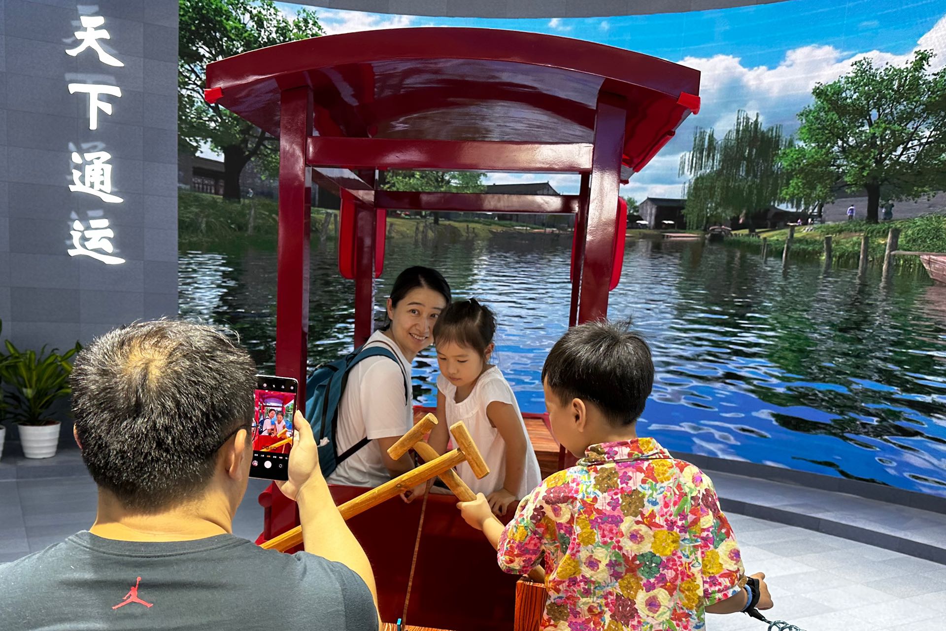 数字运河巡游是通州区结合VR等数字技术打造的一处互动体验展区,游客乘坐游船摇橹前行,屏幕中的大运河画面随之而动,人们仿佛泛舟于千年运河之上。与之相邻的通州复原古城数字还原了清代通州古城的街景画面,市民戴上VR眼镜就能穿越回去,体验当年的古风古貌。