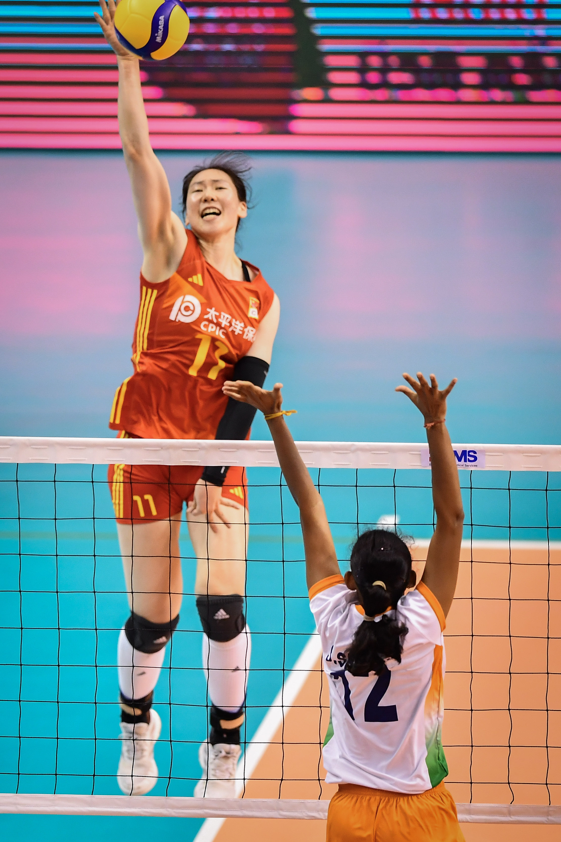 中国队首局只让印度队得到9分,以25:9拿下。接下来两局中国队也没有给对手机会,以25:10和25:12胜出。
