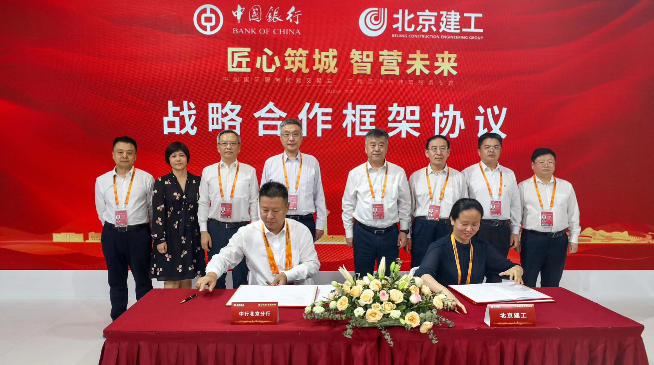 9月3日,中国银行北京市分行与北京建工集团有限责任公司在中国国际服务贸易交易会工程咨询与建筑服务展区举行战略合作协议签约仪式。中国银行北京市分行党委书记、行长王晓明,北京建工集团党委书记、董事长樊军出席活动。中行北京分行党委委员、副行长孙尚斌,北京建工集团总会计师胡娟代表双方签署协议。北京建工集团班子成员、中行北京分行资深客户经理李迎春及公司金融部相关人员出席活动。