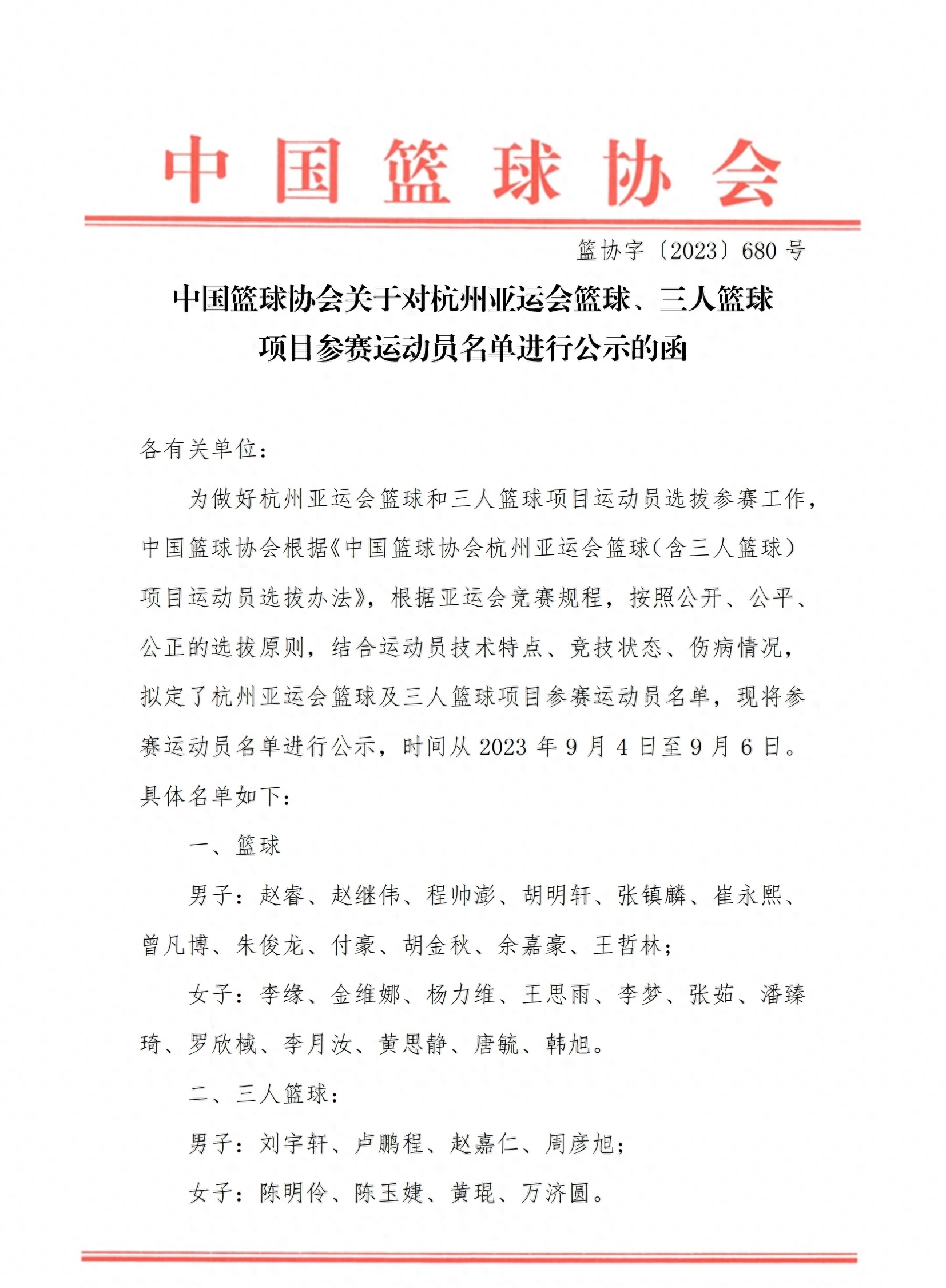 今日中国篮协公布了杭州亚运会篮球、三人篮球项日参赛运动员名单。五人男篮名单如下: