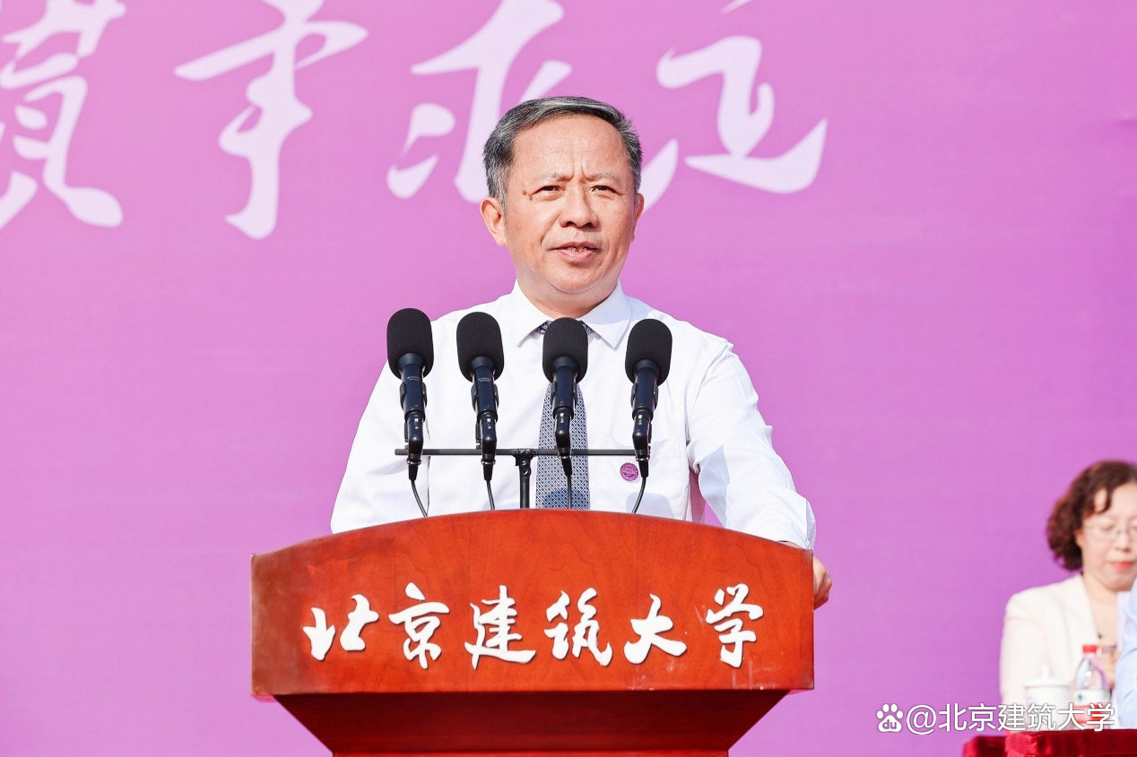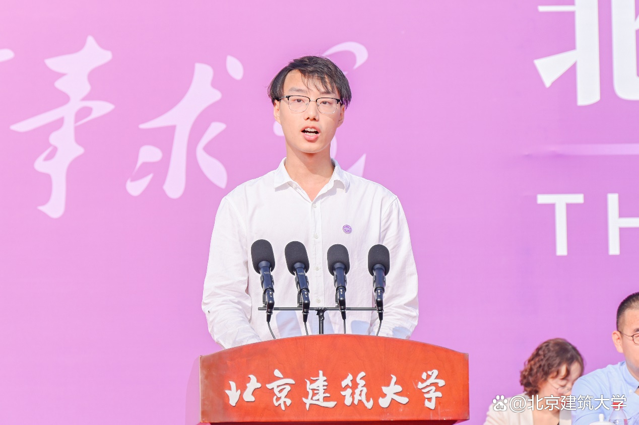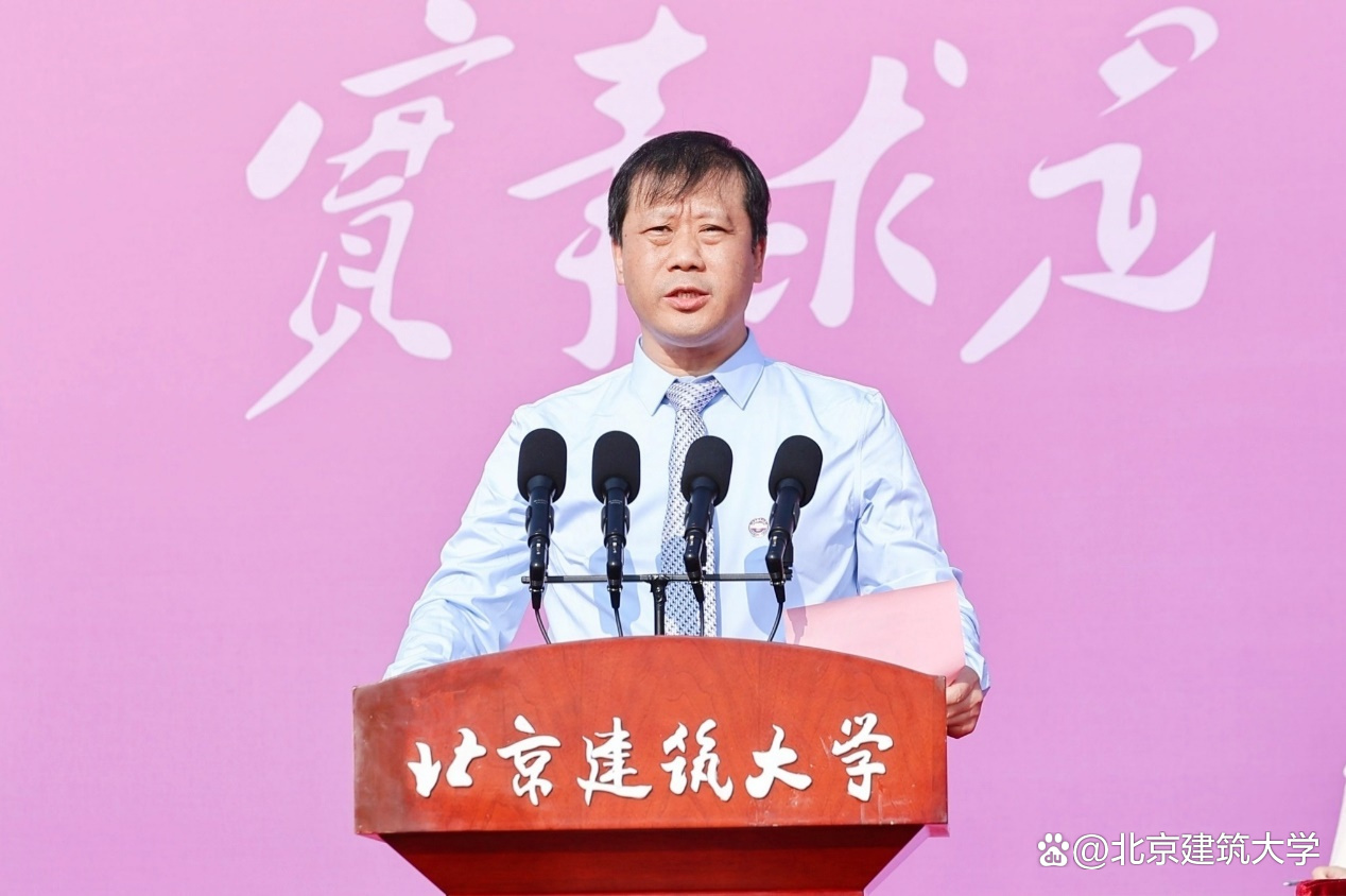 他代表全体师生员工向来自五湖四海的同学们表示热烈的欢迎,并对新生们寄予厚望,“未来的几年,我们将共迎风雨,同赏晴空。你们将是北建大精神的新担当和新传承,你们将是北建大力量的新希望和新活力,愿你们在北京建筑大学度过无悔的青春!”